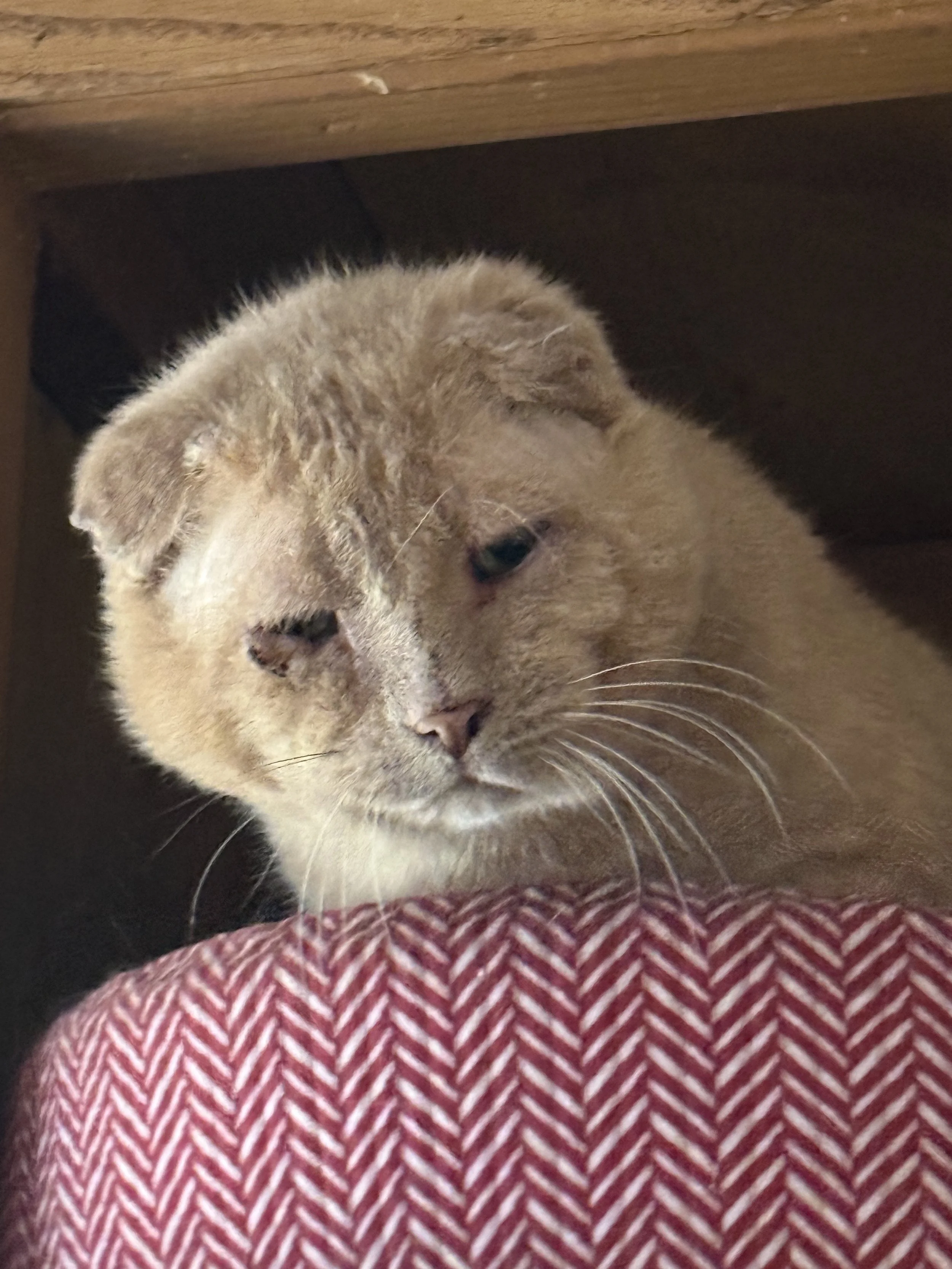 Boston is a gentle and resilient cat whose life before the sanctuary required strength, adaptability, and self-reliance. Once living outdoors and known as “Scar Face,” Boston spent years fending for himself, navigating a world that asked more of him than any cat should have to give.